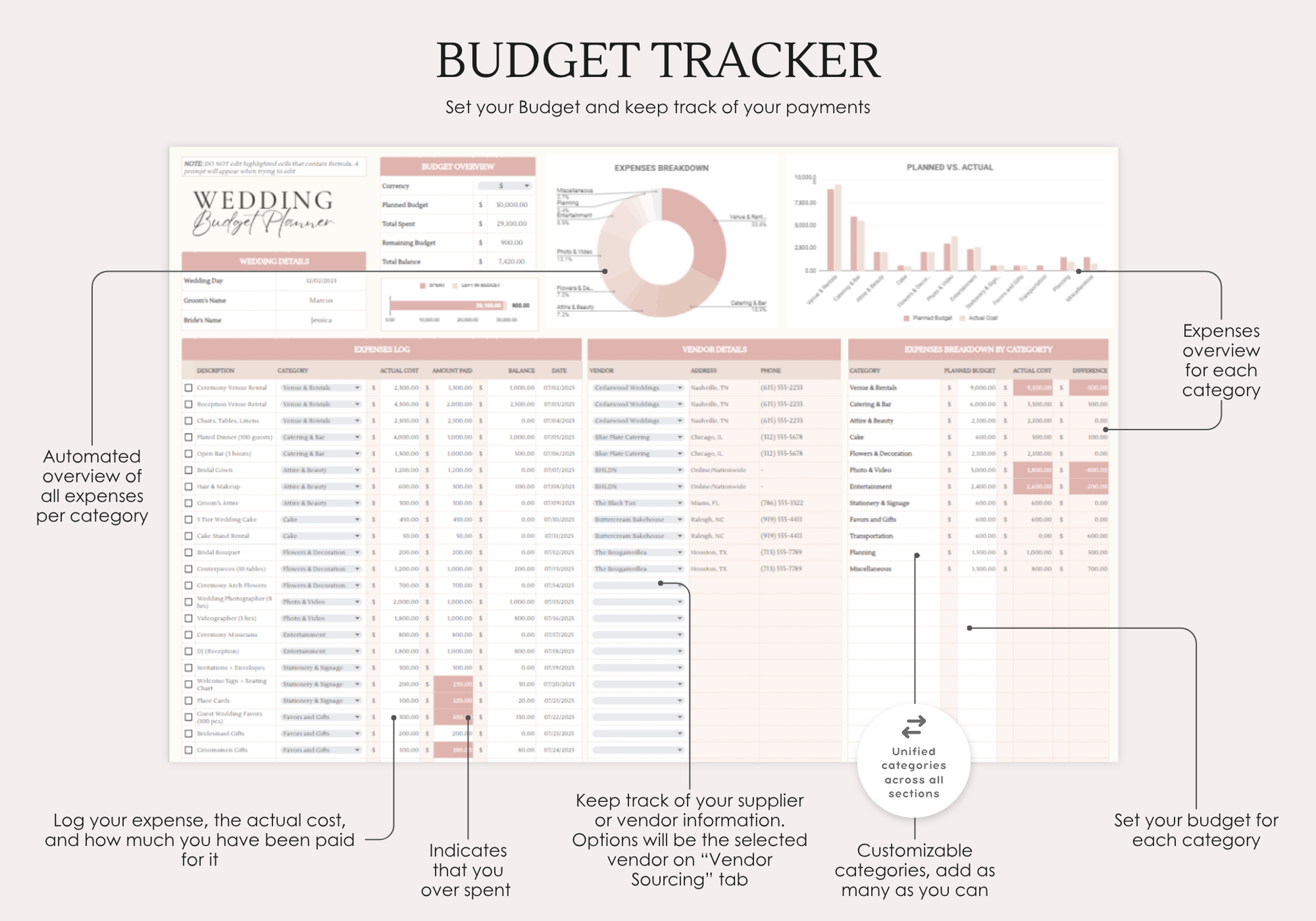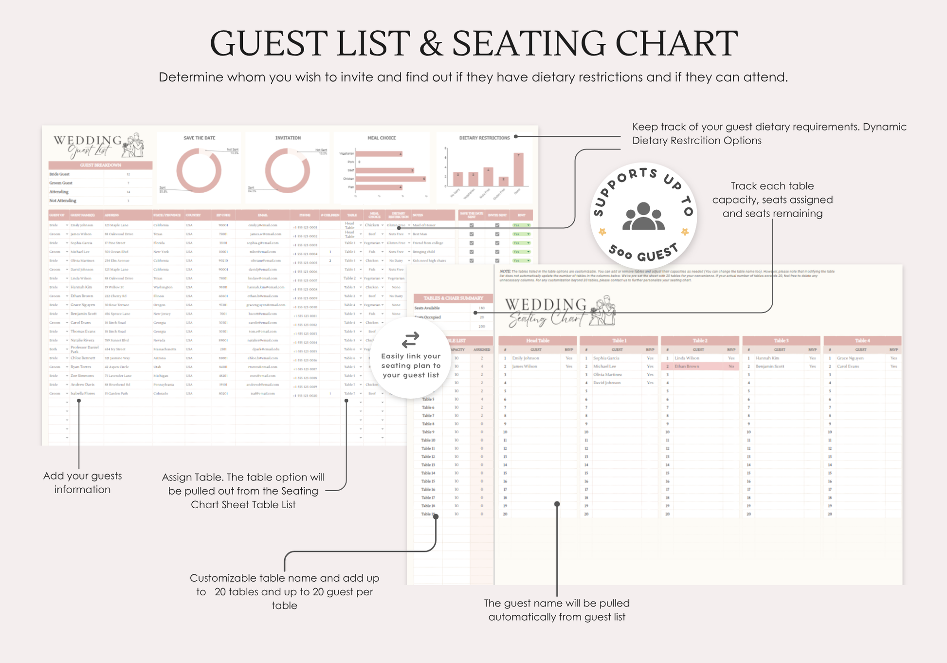 Planning for your big day doesn't need to be hectic and stressful. Simplify the process with our wedding planning spreadsheet. With it, you can track wedding expenses, make your guest list, track who is attending and their meal choices, make to-do lists with due dates, and much more!
